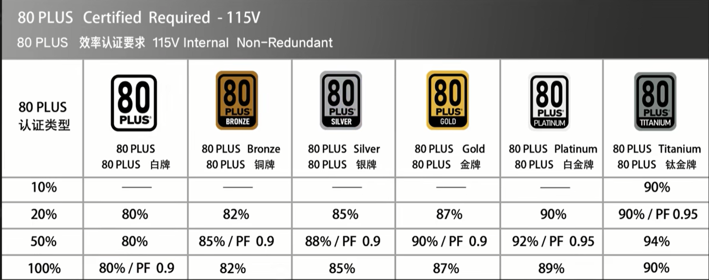 各个不同国家的市电电压不同,为了适配,80PLUS认证有两种标准 230V规格 与 115V规格。国内采用115V规格